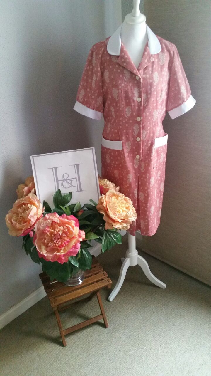 Bata para empleada de hogar en tono rosa con cuello blanco de HOME&HOPE